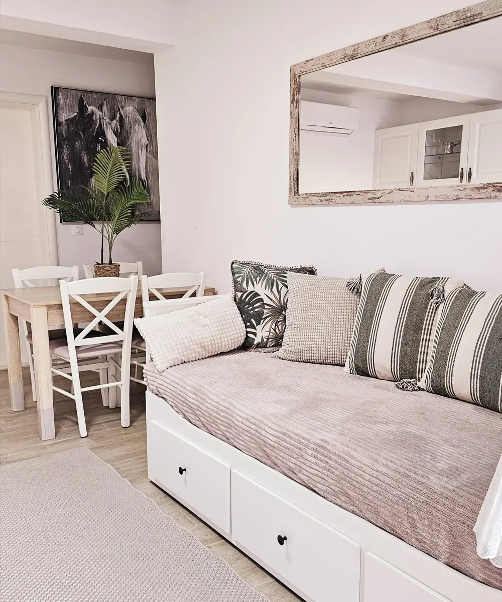 This one-bedroom apartment is calm and spacious, with a private terrace that brings in fresh air and light. A simple kitchen and bathroom complete the space, designed for quiet, unhurried days.