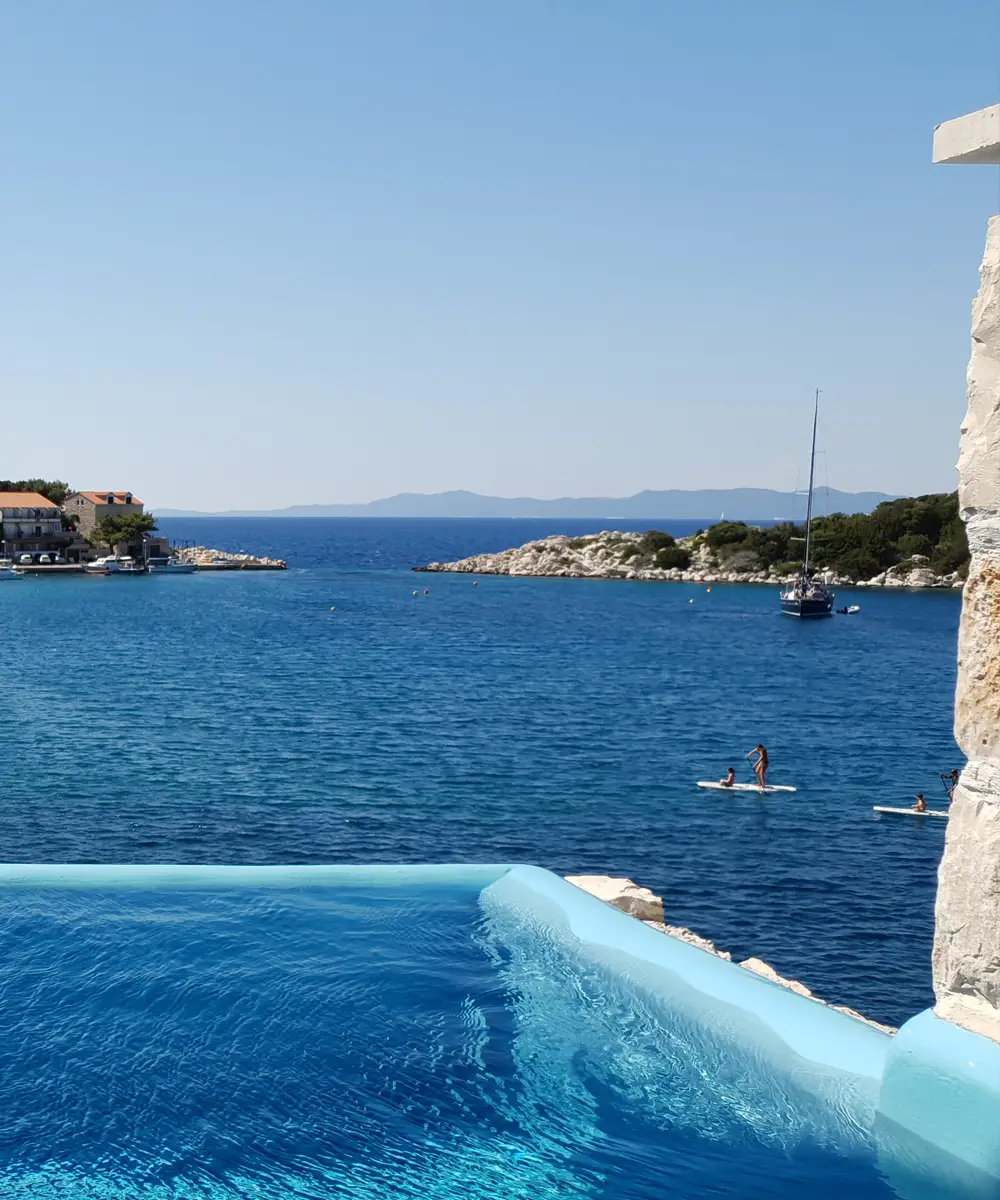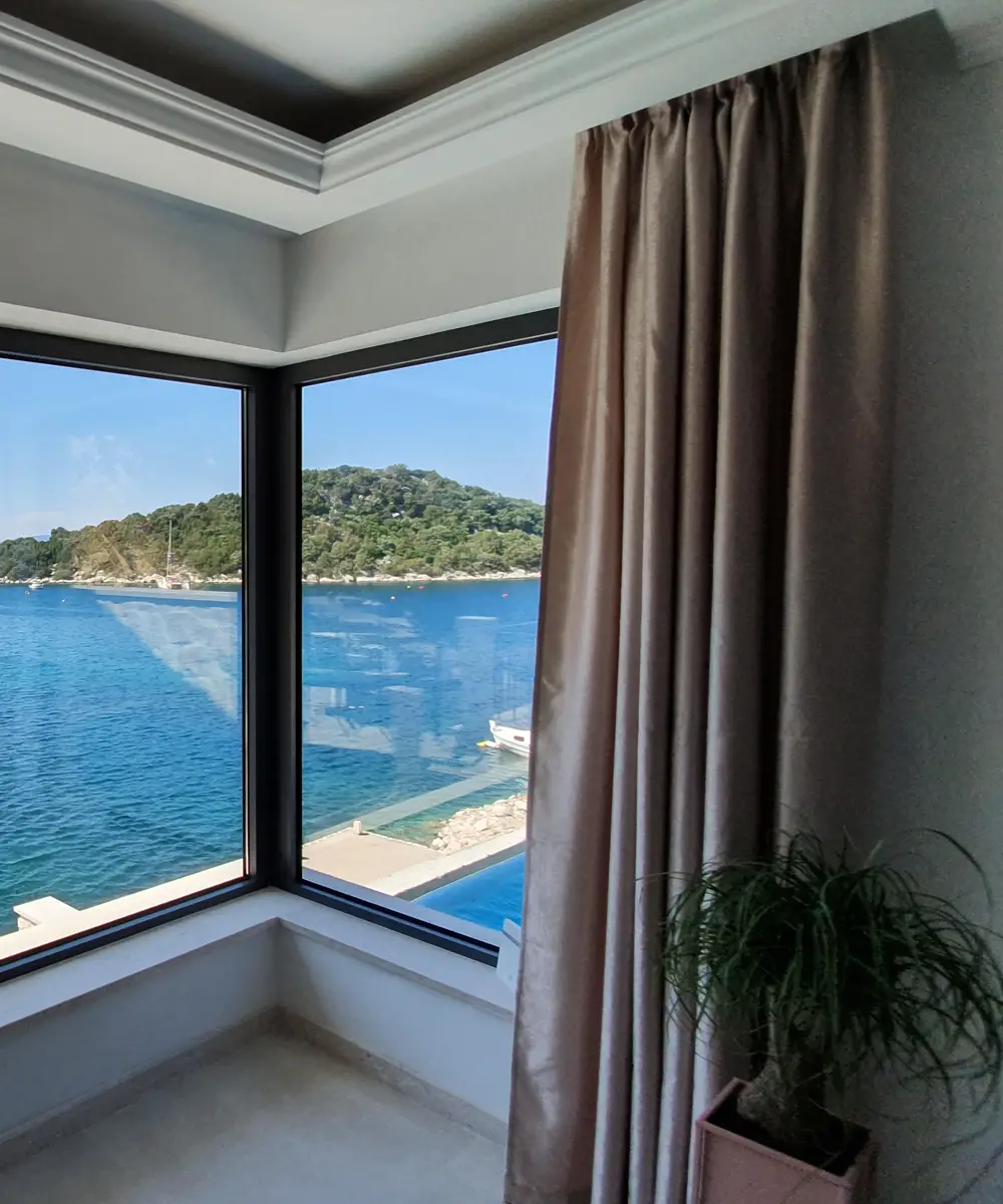 Housed within Villa Dajana, this spacious room opens to sweeping island views through expansive glass. A private terrace with its own pool invites slow mornings and sea-bound silence, while the interior balances refined minimalism with deep, effortless comfort.